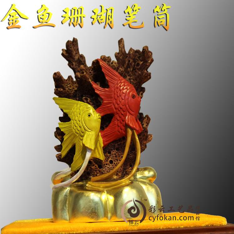 实木金鱼工艺品摆件装饰品文具笔墨纸砚收纳礼品珊瑚手工贴金笔筒
