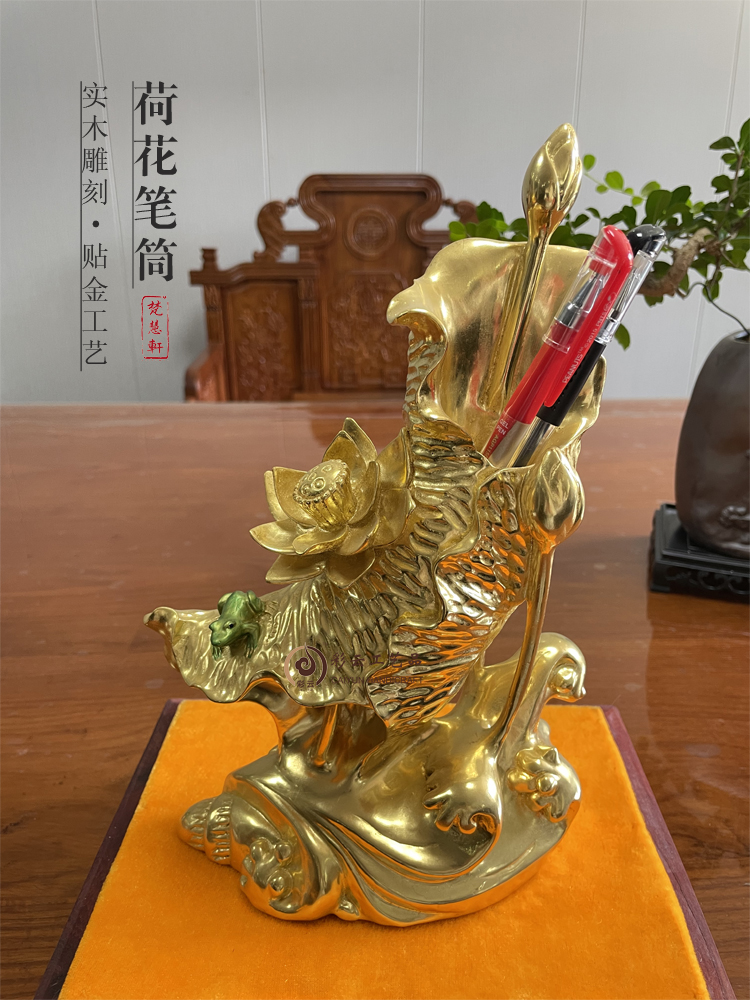 荷花笔筒装饰品家居摆件 手工雕花莳绘贴金工艺品 办公送手工礼品