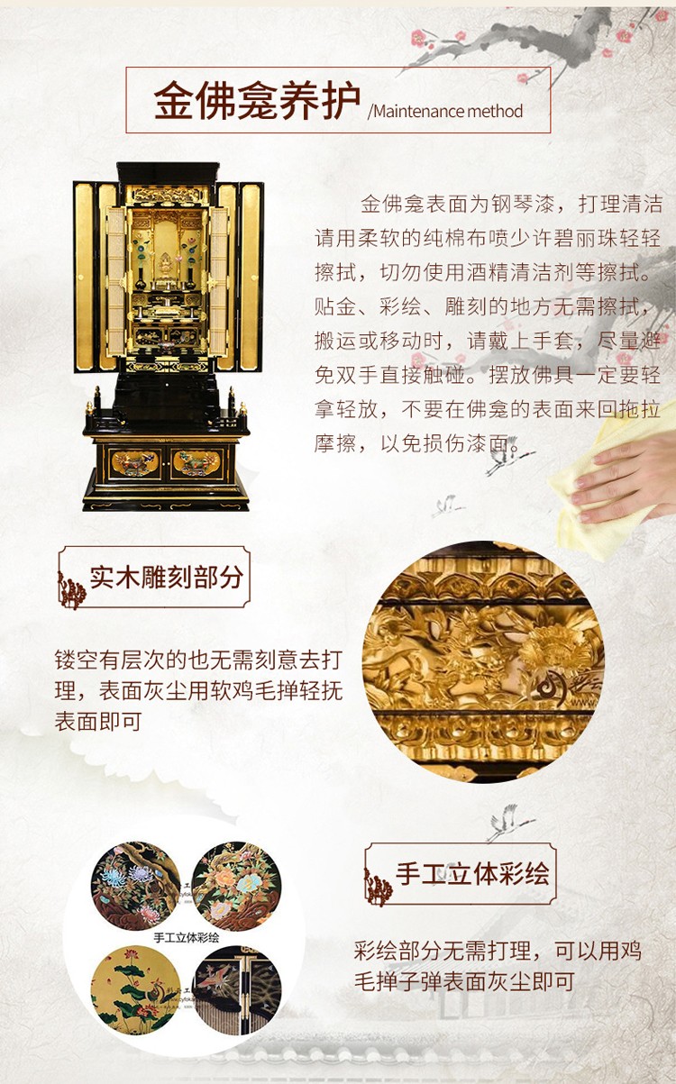 精心挑选的铜五金装饰品配件手工立体雕花采用镀金工艺,让颜色与整体一致,金碧辉煌的颜色更显庄严。